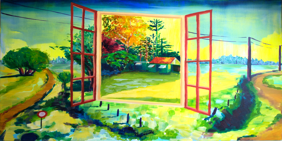 Het werk is een drieluik, waarin twee landschappen samenkomen en het raam als een punt van reflectie fungeert.