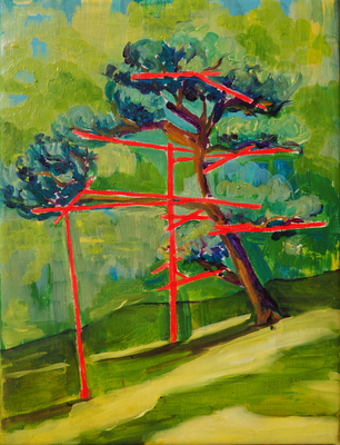 Pijnboom, acryl en olieverf op doek, 20 x 30 cm, 2023